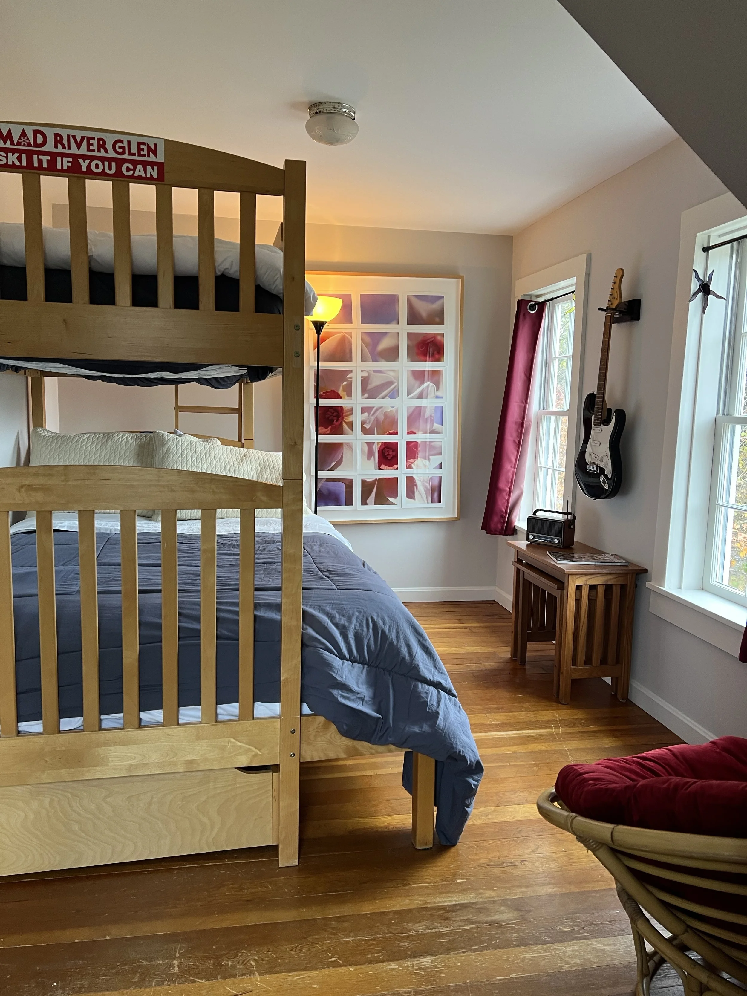 Beautiful Location on Old County Rd in Waitsfield. Enjoy cross country skiing, snow shoeing, and ice skating right outside your back door.This sunny spacious house awaits your winter occupancy. 4 bedrooms, 2 baths plus a Harry Potter room tucked under the eaves! A spacious livingroom, dining room and a 4 season porch lends to nice relaxing spaces for family and friends. A huge mudroom with the washer and dryer has lots of room for ski equipment and play space. Two spaces for cars in open barn area. The ski shuttle bus stops within a mile of the house.